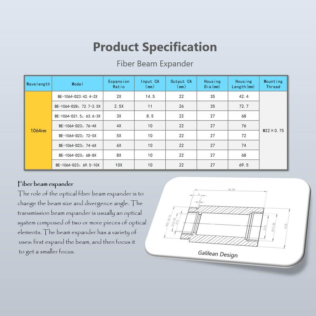 The role of the optical fiber beam expander is to change the beam size and divergence angle. The transmission beam expander is usually an optical system composed of two or more pieces of optical elements. The beam expander has a variety of uses: first expand the beam, and then focus it to get a smaller focus.
